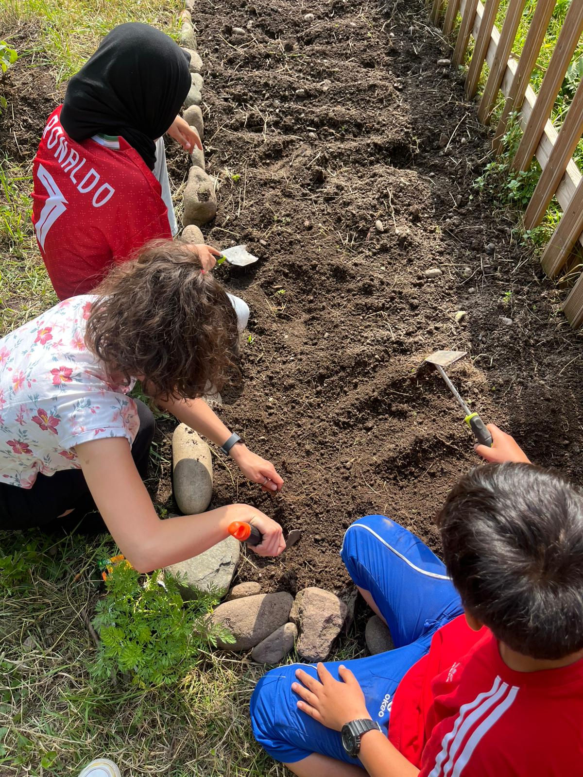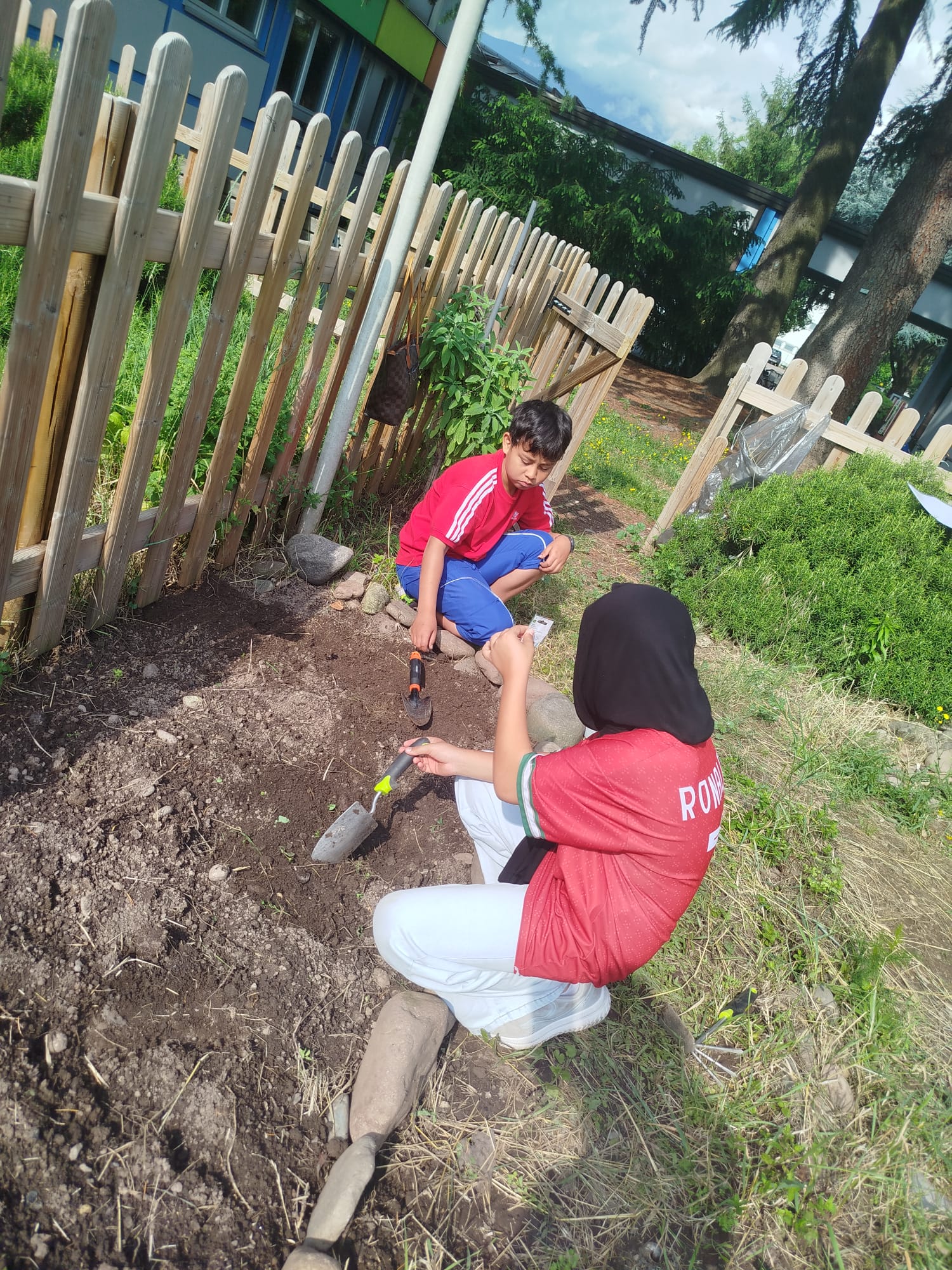 Gemeinsam mit den Erzieherinnen Sarah und Nur sowie der Schulsozialpädagogin Andrea haben die Kinder im Garten Unkraut entfernt, Beete vorbereitet, gesät, gepflanzt und gegossen.