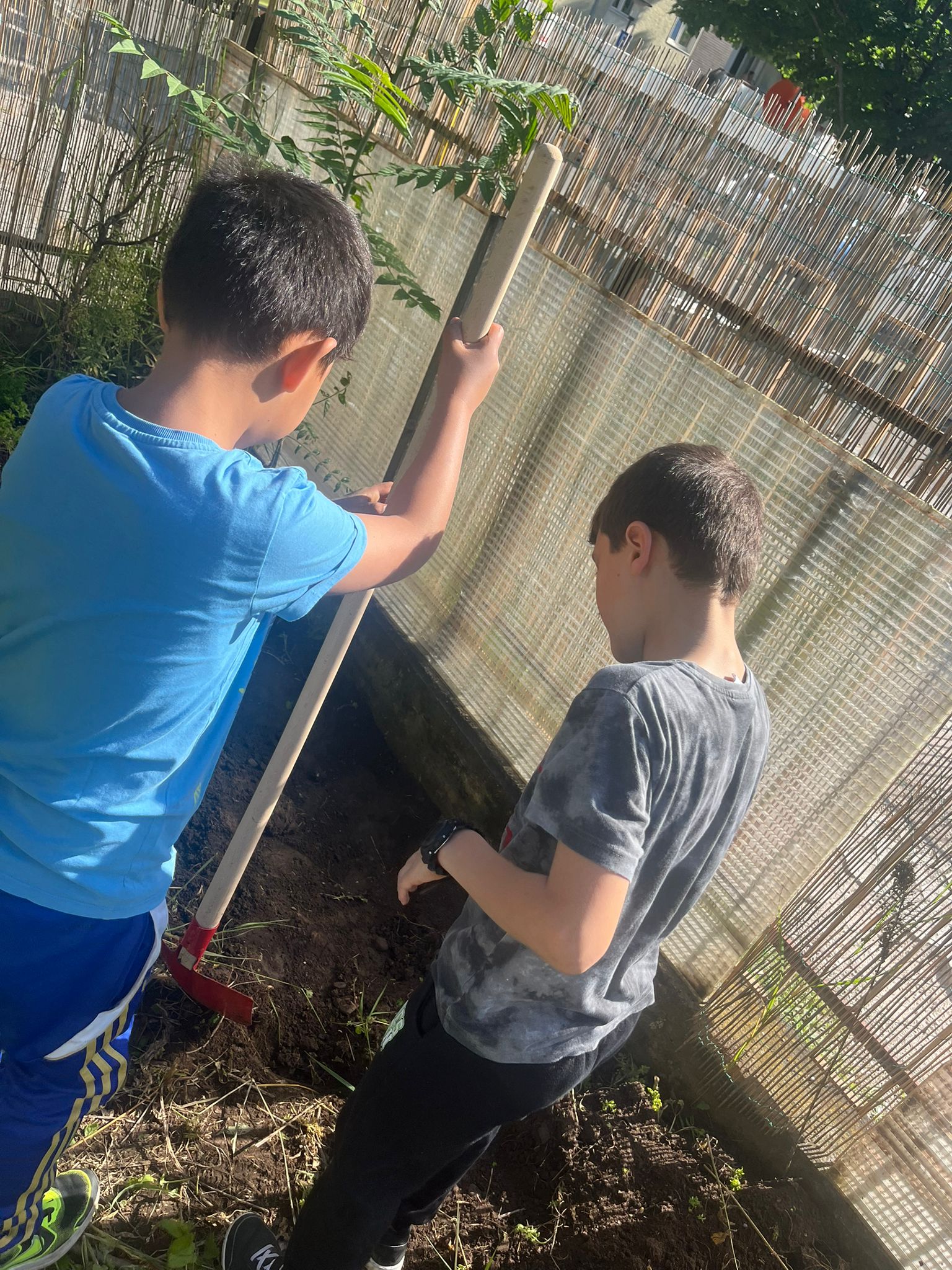 – Donnerstag, 29. Mai 2025: Unkraut jäten und Beete umgraben im Schulgarten