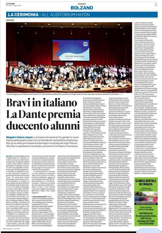 Come da tradizione la Società Dante Alighieri ha premiato gli alunni e le alunne che si sono distinti nello studio della lingua italiana nella classe finale delle scuole di ogni ordine e grado della provincia di Bolzano e per la prima volta anche del Trentino. Fra gli altri sono state premiate due alunne e un alunno della nostra scuola che hanno dimostrato grande impegno raggiungendo notevoli risultati. Complimenti a Anissa, Valentina e Mohamed ai quali va l’augurio di continuare il loro percorso di studi con la stessa passione e costanza dimostrati finora.